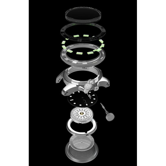 ▪ 錶殼:不銹鋼錶殼/藍寶石水晶玻璃雙向轉動弧形外圈,配有自體發光微型氣燈,方便夜間讀時/Mu-metal高導磁合金保護罩/專利註冊 Amortiser® 防震裝置