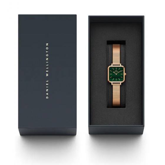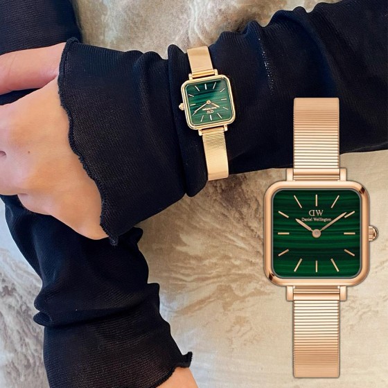 Quadro Studio採用精緻小巧的伯朗大道綠正方形錶盤,搭配時尚流線的鋼琴錶帶。 採用拋光不銹鋼製成,並提供精緻的玫瑰金鍍層,永恆的新復古時尚宣言。