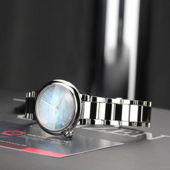 錶盤搭載一顆鑽石,藍寶石水晶鏡面