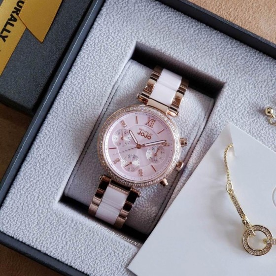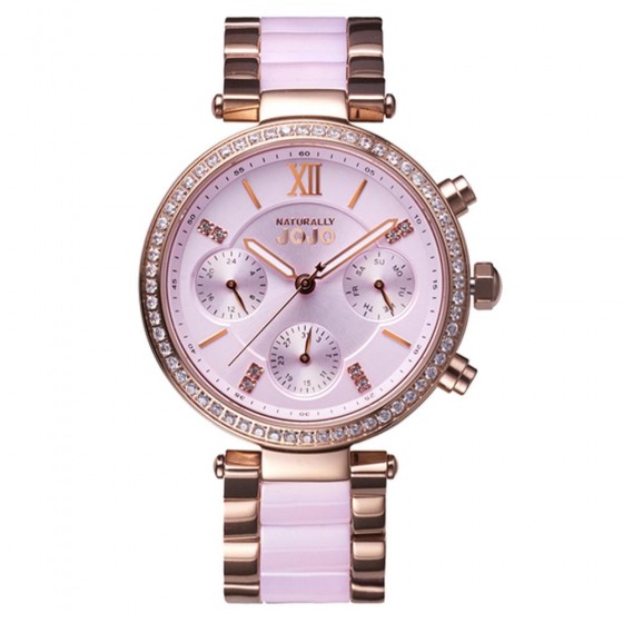 NATURALLY JOJO JO96973-10R 奢華鑲鑽三眼粉陶不鏽鋼錶