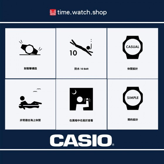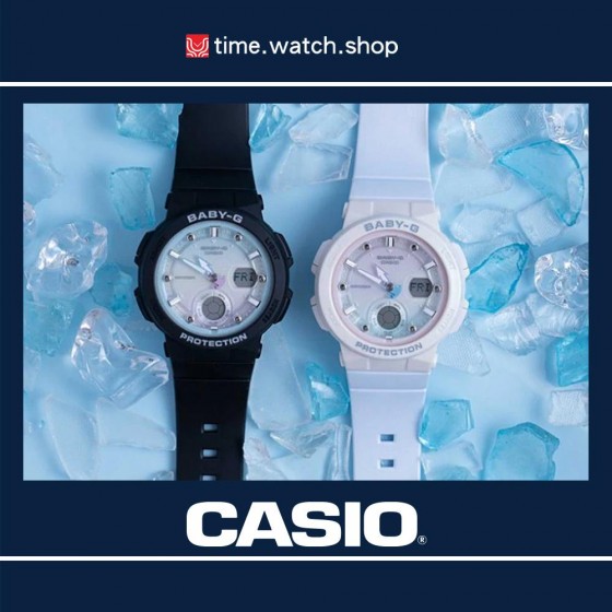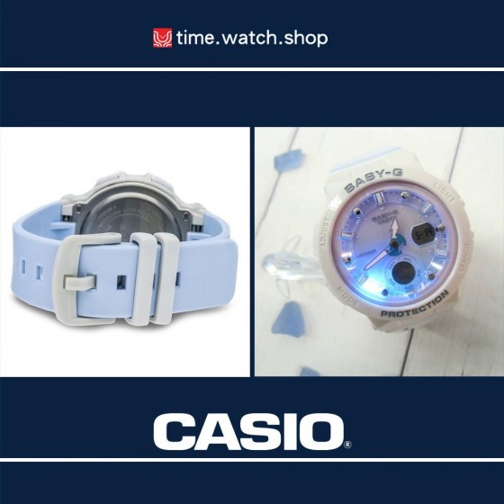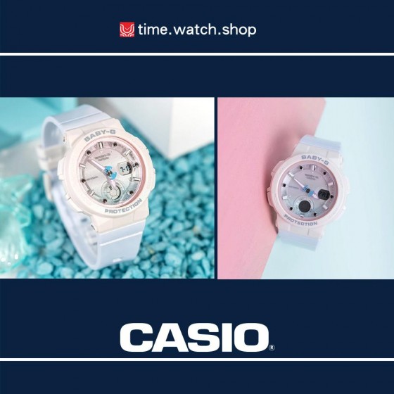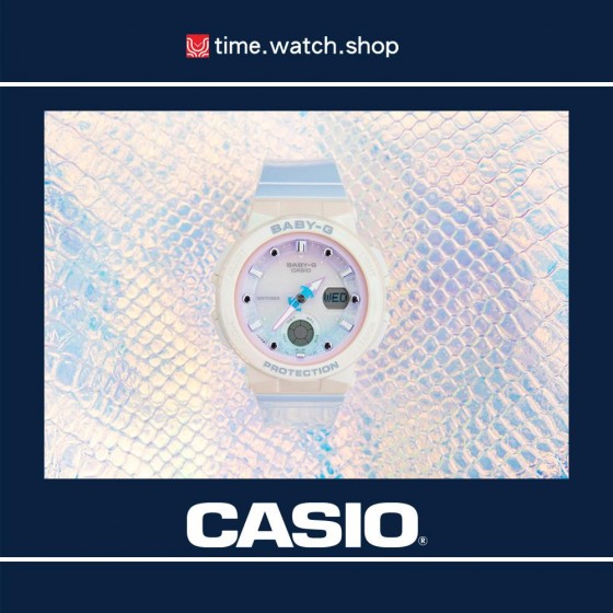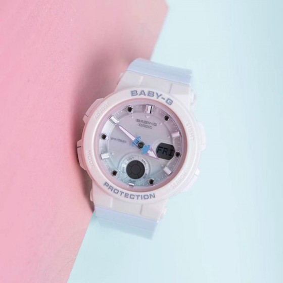 全新BABY-G BGA-250設計概念來自對海洋的熱愛,眾多設計巧思皆啟發自海洋,金屬質感的整點時刻在水藍色的錶盤上,猶如海面上的波光粼粼。在各個細節處也能發現海洋風格的設計巧思,例如整點時刻的條狀與圓點設計,來自船舵的概念,而時針則以船錨的形狀為靈感所設計,BGA-250同時搭載霓虹照明功能,在錶盤和指針上加上一層特殊的塗料,讓照明後的燈光更加生動活潑。