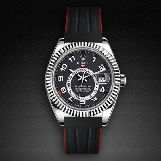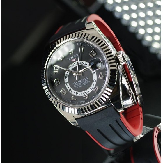 硫化雙色橡膠錶帶設計適合勞力士 SkyDweller 和 Oyster Deployant 帶扣*(不兼容金錶鍊版本。僅兼容最初配備鱷魚帶的 SkyDweller 版本)。這款錶帶採用“Blocked Integration”工程,結合實心嵌件,可完美、靜止地嵌裝在錶殼上。