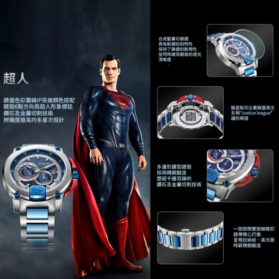作為正義聯盟超級腕表的開發專家,DAUMIER設計師們希望通過「超級英雄都應該戴表」理念呼籲「正義聯盟」部分沒有佩戴腕表習慣的忠實粉絲們,能在佩戴「超級腕表」的同時體會到在現實中,我們都需要變身,成為生活中的英雄,在不同場合佩戴不同規格的手錶,展現時尚及專業的不同身分。DAUMIER丹瑪聯乘正義聯盟的亮點圍繞「現實生活中的超級英雄」為主題,完成了JUSTICE LEAGUE腕表設計及生產的艱巨任務。作為腕表界的創作先鋒,DAUMIER確切地實現了GGV品牌價值:G-good design 優質設計G-good Quality 品質優良Value for Money 物超所值優質設計、品質及物超所值的理念,把佩戴腕表的習慣重新定義,同時執行屬於國際品牌、企業的社會責任。