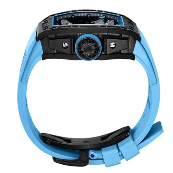 機芯資料及功能:高擺動頻率陀飛輪鏤空設計手動上發條機械機芯,陀飛輪透視劍形橋拱及六角型蜂巢式設計機芯支架,並獲得外觀設計專利