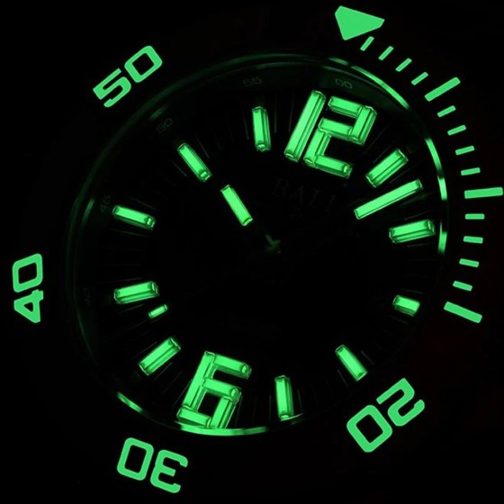 錶盤上鑲嵌了自體發光微型氣燈,克服於昏 暗環境不能清晰讀取時間的問題。以微型氣燈 組成的阿拉伯數字及刻度,除了在黑暗環境綻 放懾人光茫外,日光之下觀賞依然是十分搶 眼。三支指針上都同樣配有微型氣燈,再加上 單向轉動錶圈上的帶有「Super LumiNova」超級 夜光塗層的刻度,就算在昏暗的水底下,依然可使用錶圈輕鬆計算已下潛時間。