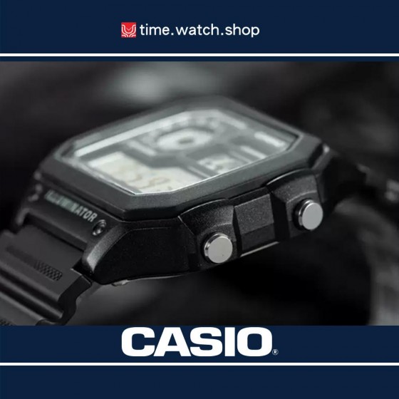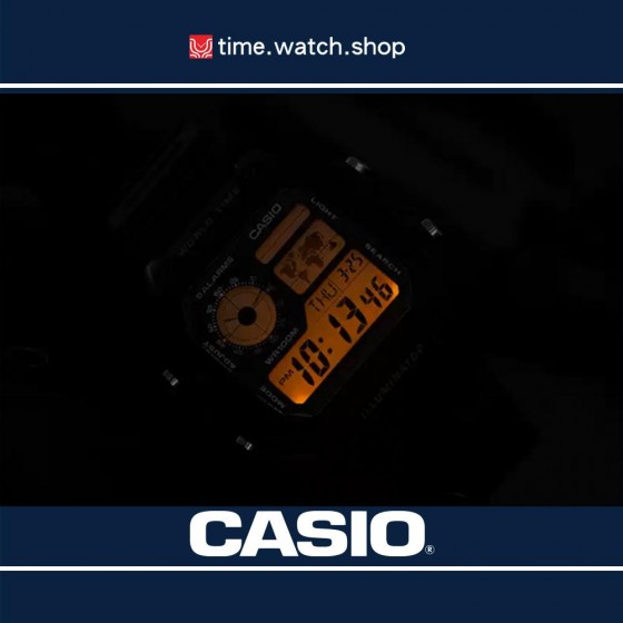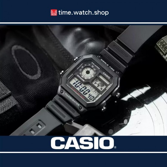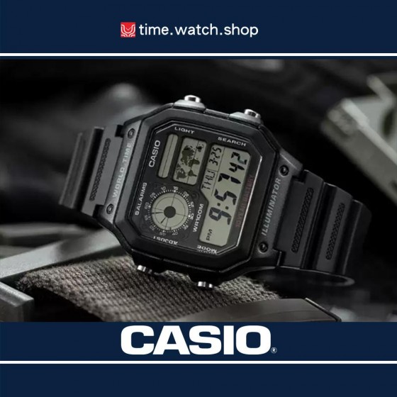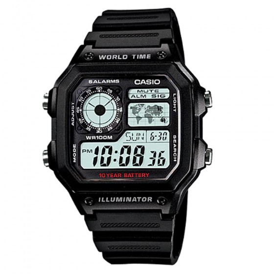 10年電力電子錶款AE-1200WH系列,以右上角的世界地圖顯示世界時間地點,並可同時保存4個世界城市時間方便檢視。搭載防水100米、LED照明、1/100秒計時碼錶、倒數計時、每日鬧鈴等功能。