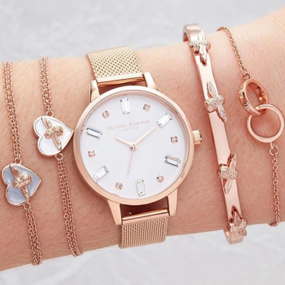 Olivia Burton London 純白錶盤綴以晶透感十足的晶鑽刻度,增添 Bejewelled 系列迷人輕奢感,造型亮眼之外,更要加倍閃耀妳的每日穿搭。