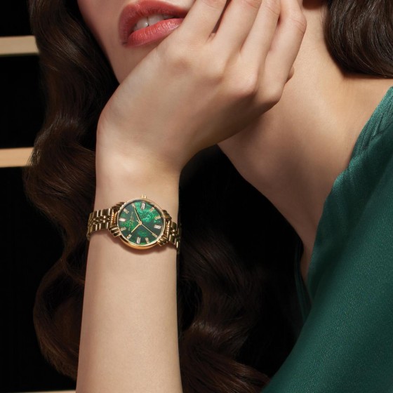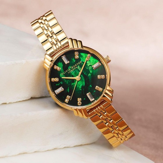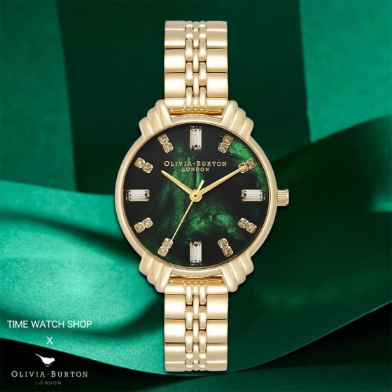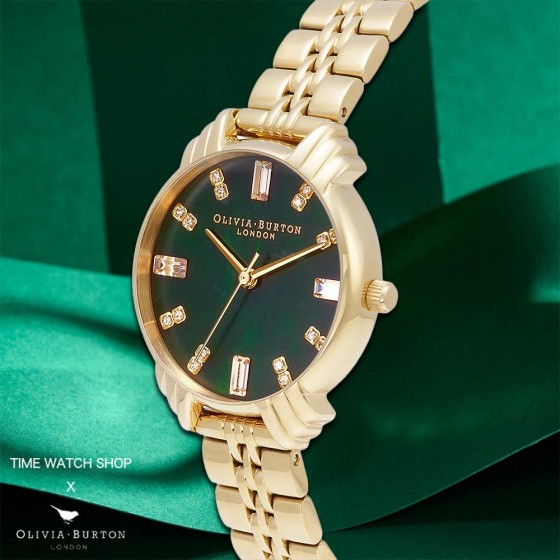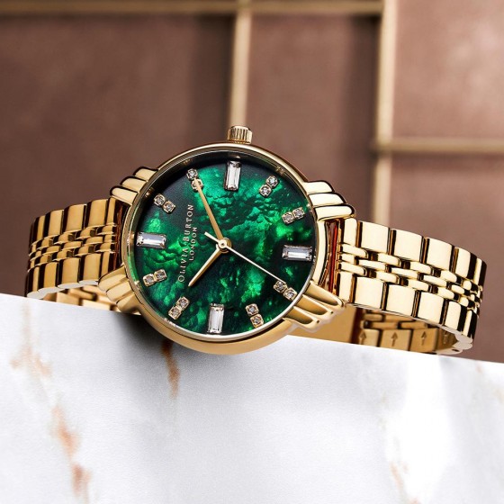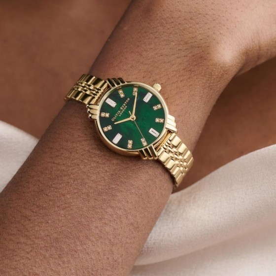 Olivia Burton 重現美好年代的迷人風采 ! 受到 Art Deco 裝飾藝術風格的啟發,這款華麗腕錶將我們帶回了風華絕代的 20 年代。 以耀眼的翡翠綠搭配閃耀珍珠母貝與奢華水晶刻度,復刻這個美好年代的獨特魅力。
