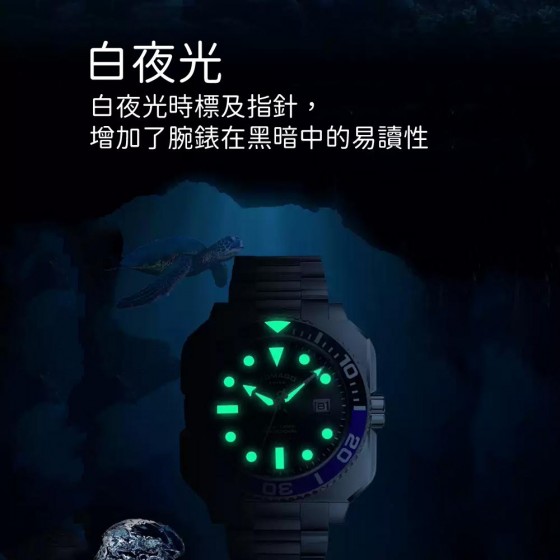 專為潛水愛好者而設的運動型腕錶,46毫米的錶殼以不鏽鋼打造,其「方中帶圓」的設計,配搭單向旋轉錶圈及橡膠錶帶,有利於水中操作。在錶盤上的時分指針和大型時標均覆有超級白夜光塗層物料,即便在漆黑之中,仍能輕易地讀取時間。搭載瑞士製自動機芯,腕錶具有日曆功能,防水深度達300米。
