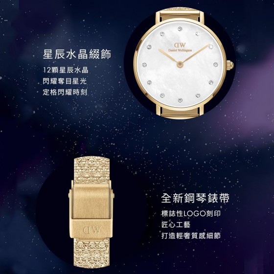 DANIEL WELLINGTON Petite 白色珍珠母貝腕錶,見證自然之美也可以醞釀出極致奢華。每個錶盤都採用珍珠母貝精製而成,紋路獨一無二。以水鑽精鑲的刻度,讓錶面由內而外散發柔美的光澤。腕錶搭配我們最新的 Studio 壓紋金屬錶帶,其有如流雲般的閃動光澤與珍珠母貝的紋路相互輝映。
