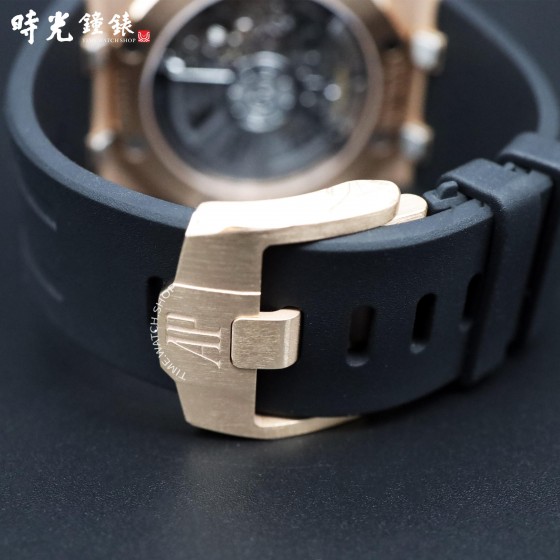 【錶帶】:黑色易換式橡膠錶帶18K玫瑰金AP字樣針式帶扣。附帶一條黑色鱷魚皮錶帶