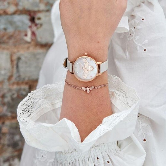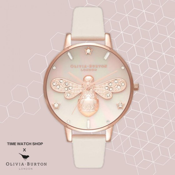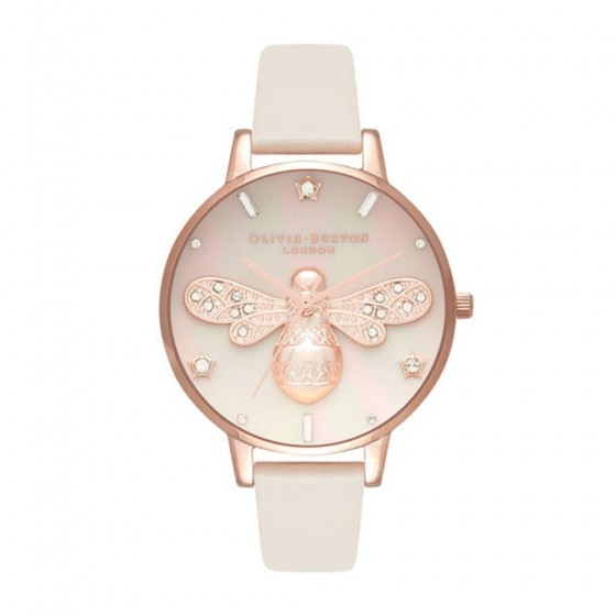 Olivia Burton OB16GB10 玫金殼3D蜜蜂白貝面嫣杏色皮帶腕錶
