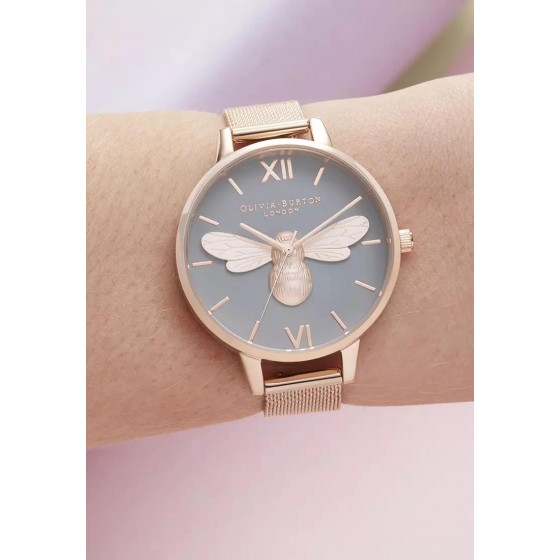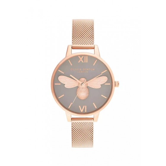 • 【高雄時光鐘錶】 OLIVIA BURTON 灰面 立體蜜蜂 玫金殼 米蘭帶腕錶 LUCKY BEE OB16FB10