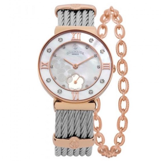 秒針盤以獨特的芙蓉花型呈現,設立在6點鐘的方向,白色珍珠母貝的面盤結合細膩的芙蓉花紋,在不同光線裡熠熠生輝。