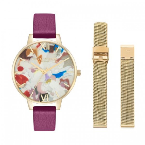 Olivia Burton OBGSET153 金殼太陽紋彩屑彩繪銀面紫色ECO帶腕錶 不鏽鋼米蘭帶套組