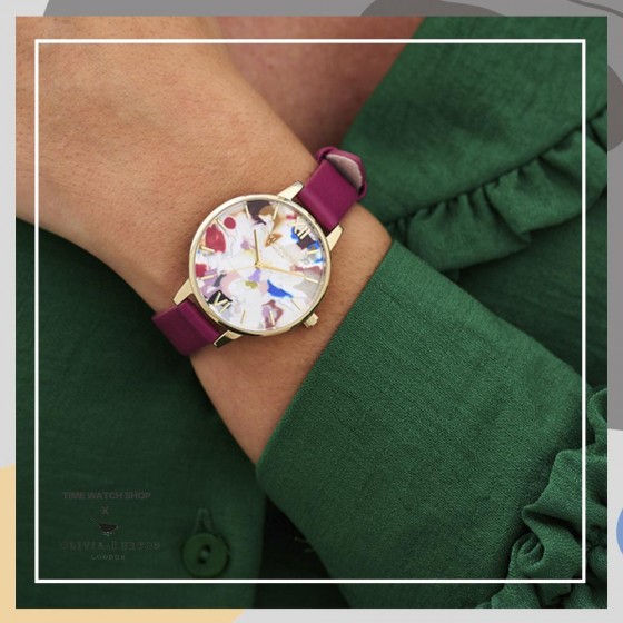 • Olivia Burton OBGSET153 金殼太陽紋彩屑彩繪銀面紫色ECO帶腕錶 不鏽鋼米蘭帶套組